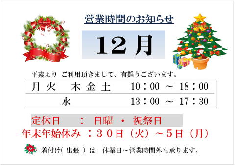 休業日 : 年末年始、季節休み、日曜祝祭日(変更あり)